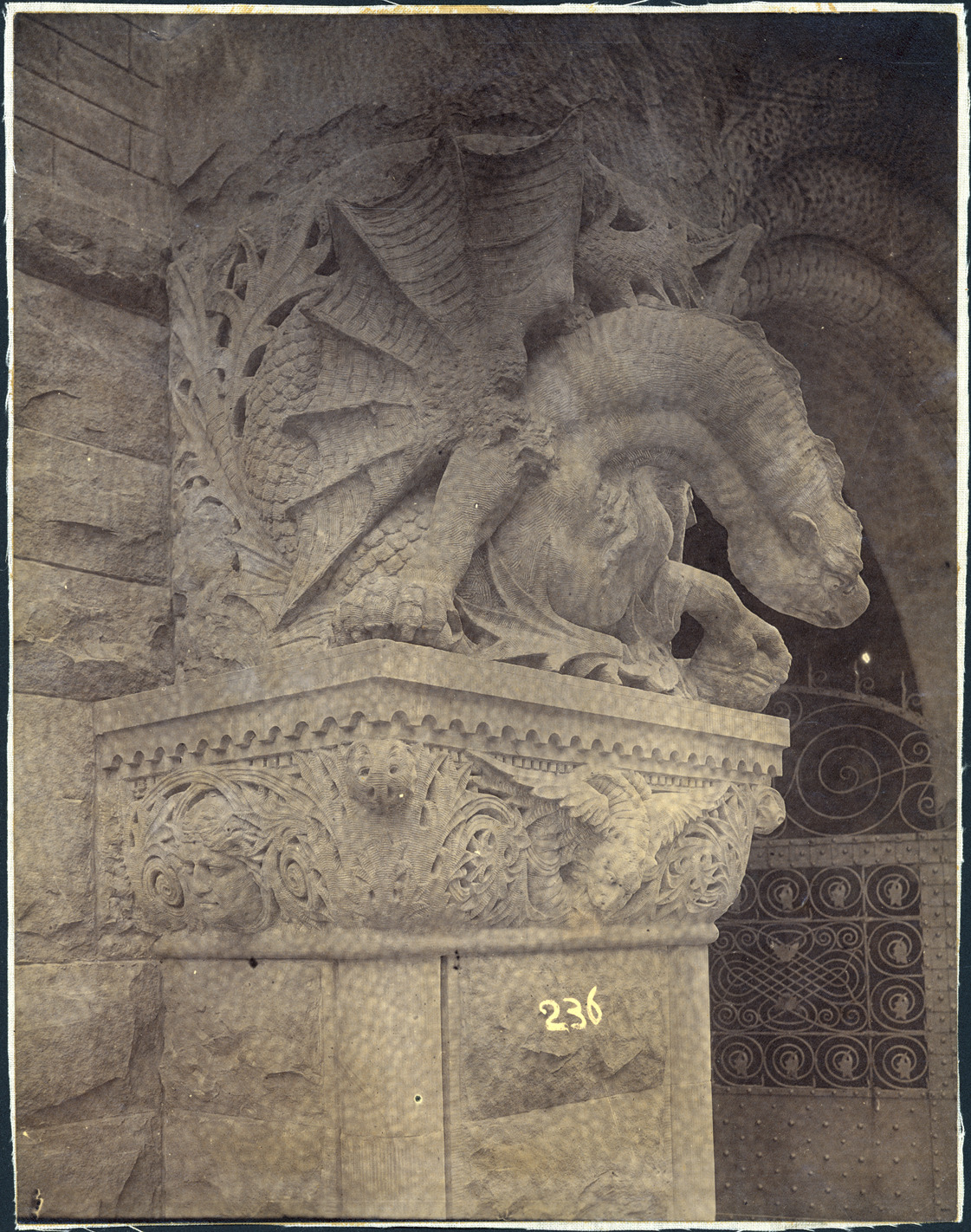 Favorite this☆ Architectural detail of stone dragon for Grand River Avenue Y.M.C.A. Description: Carved stone dragon at entrance to Y.M.C.A. Written on photo back: "Y.M.C.A.-N.E. Corner Gr. River & Griswold." Details Resource ID: MR0841 Creator: George D. Mason & Co. Subject: Stone carving--Michigan--Detroit Architecture--Details Albumen prints Photographic prints Date Issued: 1883 (year approximate) Format: 1 photographic print mounted on linen ; image 9.25 x 7.25 in. Member of: Burton Historical Collection Filing Location: D/Architecture-Mason & Rice Colln.-Y.M.C.A. Rights: Physical rights are retained by DPL. Copyright is retained in accordance with U.S. copyright laws.