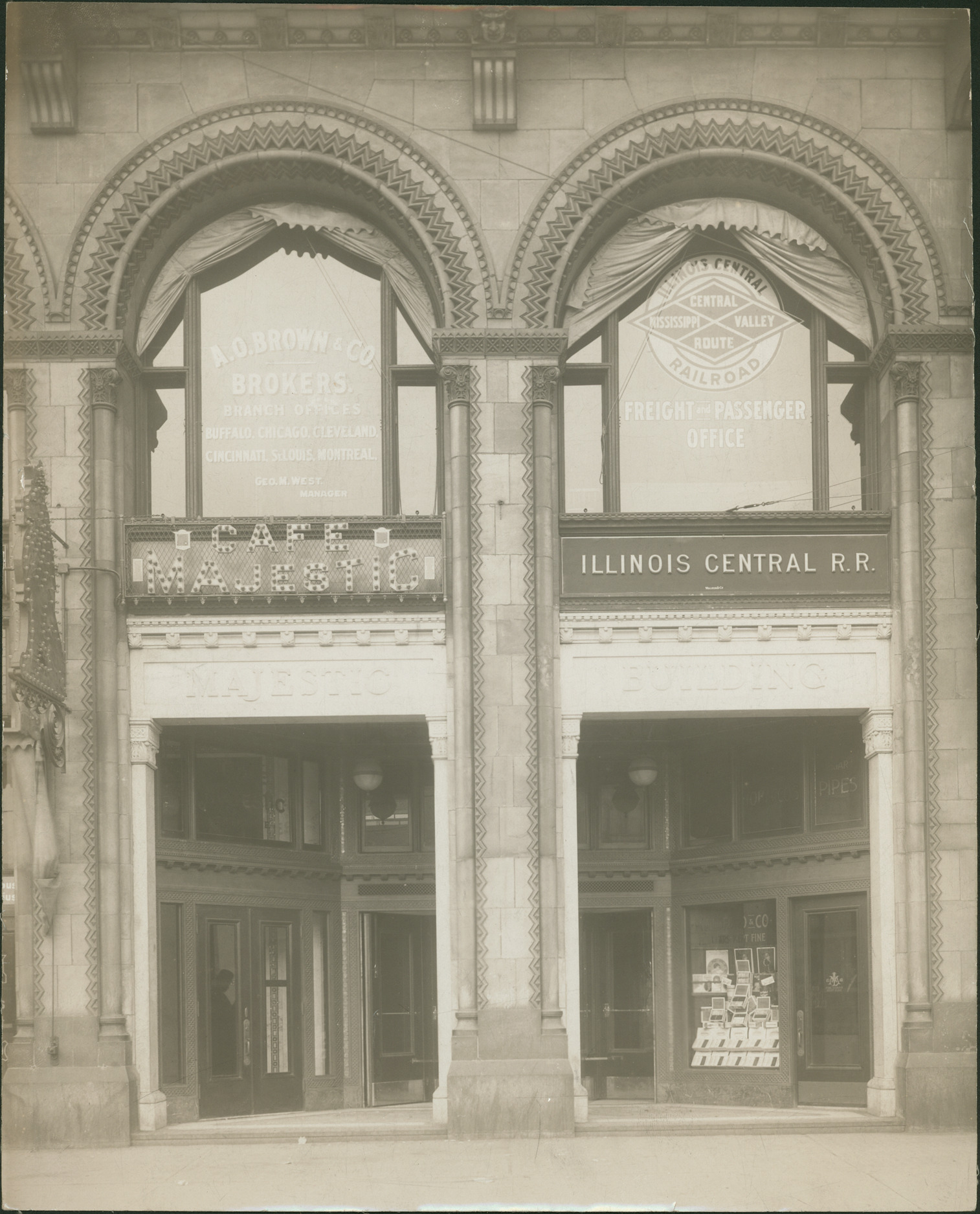 Favorite this☆ Majestic Building Description: Detail of the Majestic Building showing name above arched, stone entryway, and signs for Cafe Majestic and office of Illinois Central Railroad. Details Resource ID: MR0910 Creator: George D. Mason & Co. Subject: Architecture--Details Commercial buildings--Michigan--Detroit Photographic prints Date Issued: 1896 (year approximate) Format: 1 photographic print ; 12.5 x 10 in. Member of: Burton Historical Collection Filing Location: D/Architecture-Mason & Rice Colln.-Majestic Building Rights: Physical rights are retained by DPL. Copyright is retained in accordance with U.S. copyright laws.