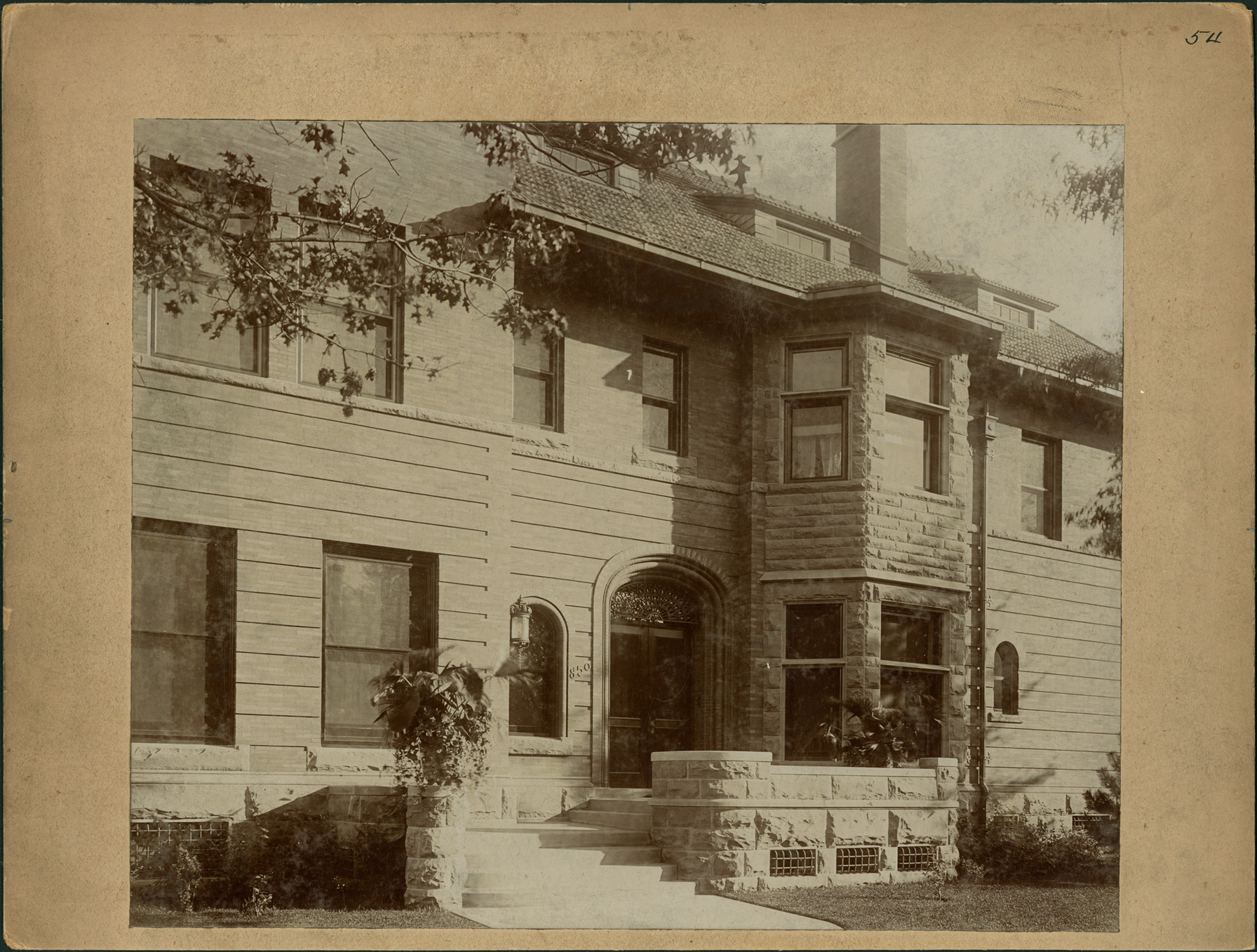 Exterior view of the F.H. Walker home, showing entrance with house number 850 (Jefferson Ave.) Written on photo back: "Res. Franklin H. Walker, Detroit, Mich., main entrance, north front." Stamped on photo back: "Office of Mason & Rice, architects, 80 Griswold St., Detroit, Mich."