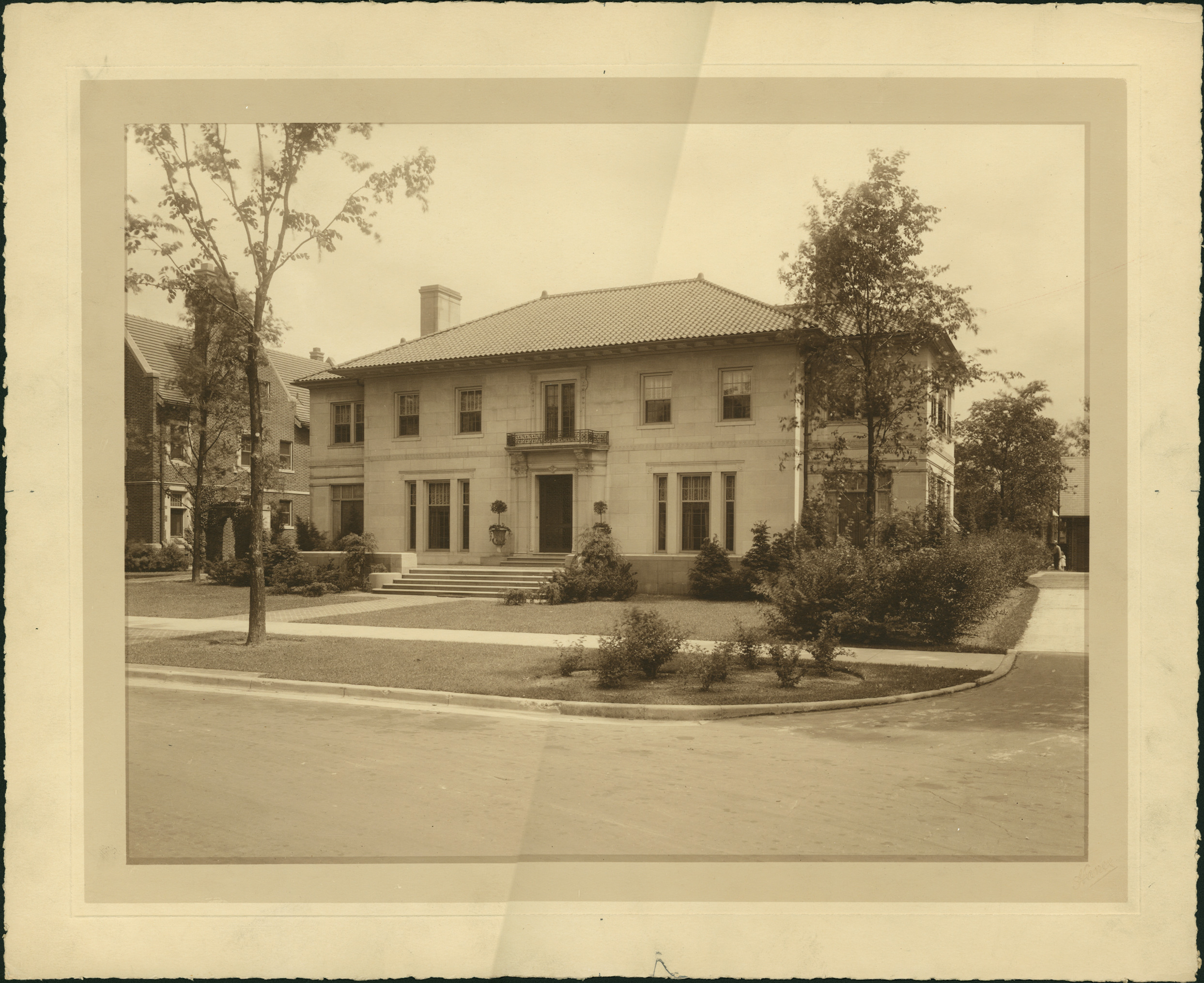 Exterior view of the Frederick J. Fisher residence an Italian renaissance style home. Embossed on photo front: "Hance." Written on photo back: "54 Arden Park." Stamped on photo back: "George D. Mason & Co., architects, 508 Griswold St., Detroit, Mich."