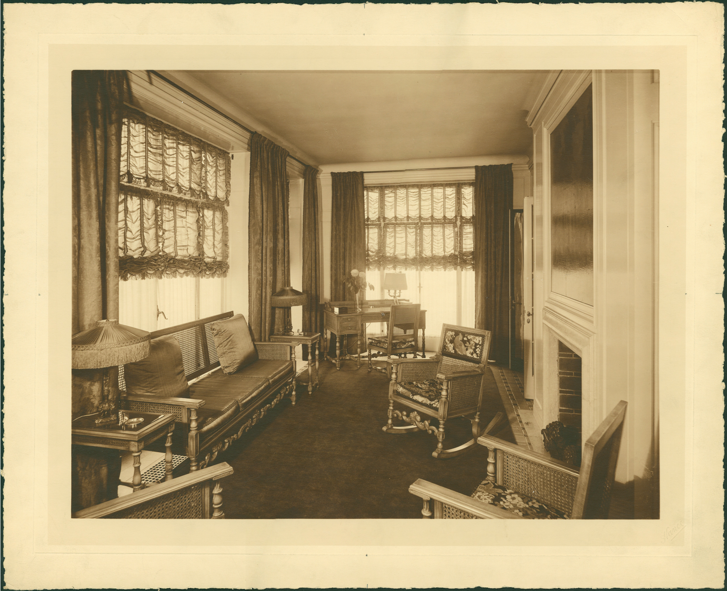 Informal living space showing furniture with cane-woven sides and backs and partial view of fireplace, ceramic-tiled floor covered by rug. Embossed on photo front: "Hance." Stamped on photo back: "George D. Mason & Co., architects, 508 Griswold St., Detroit, Mich."
