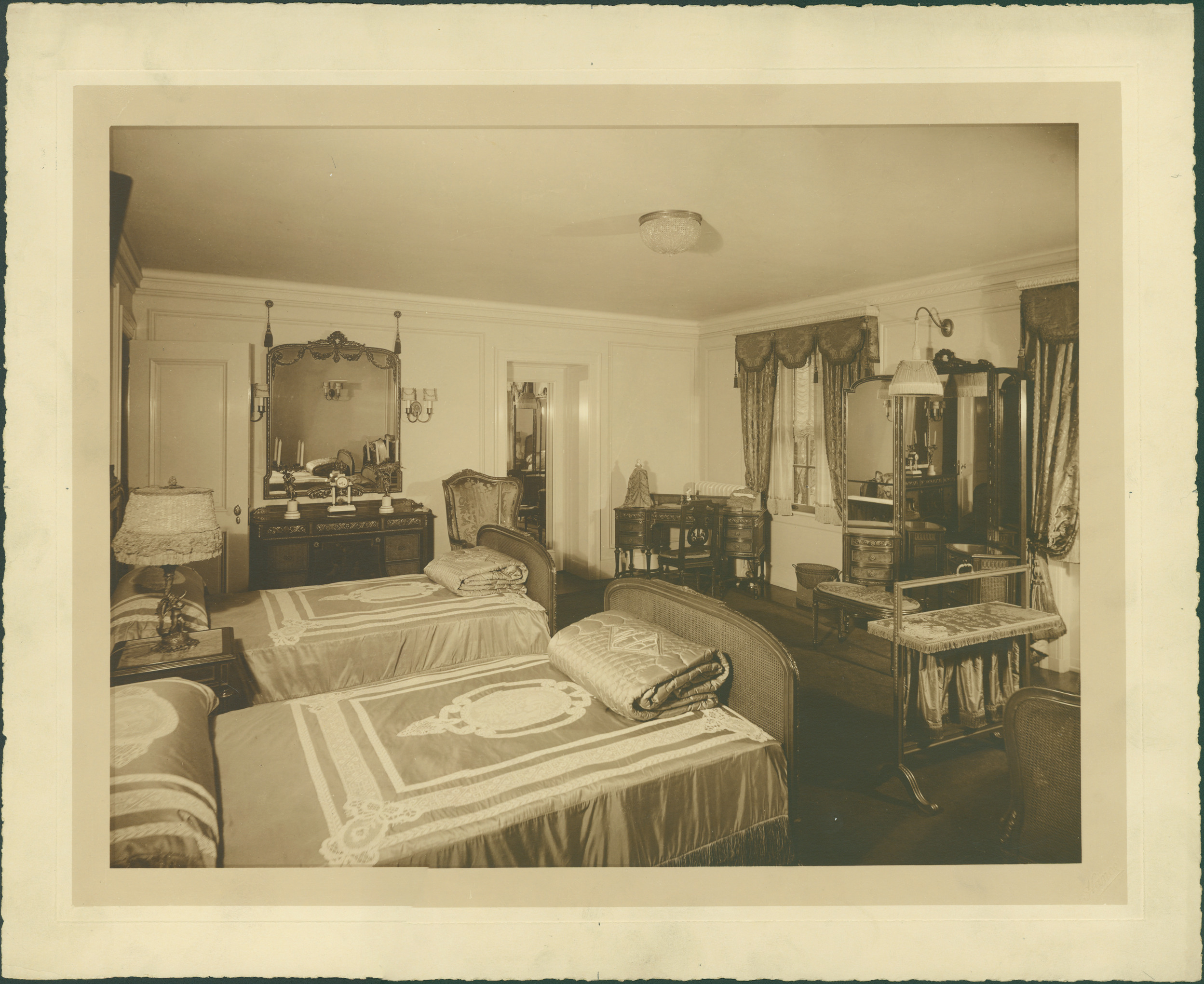 Bedroom with twin beds, monogramed satin quilts on each, chest of drawers, desk and dressing table of dark color with cane on drawer fronts. Embossed on photo front: "Hance." Stamped on photo back: "George D. Mason & Co., architects, 508 Griswold St., Detroit, Mich."