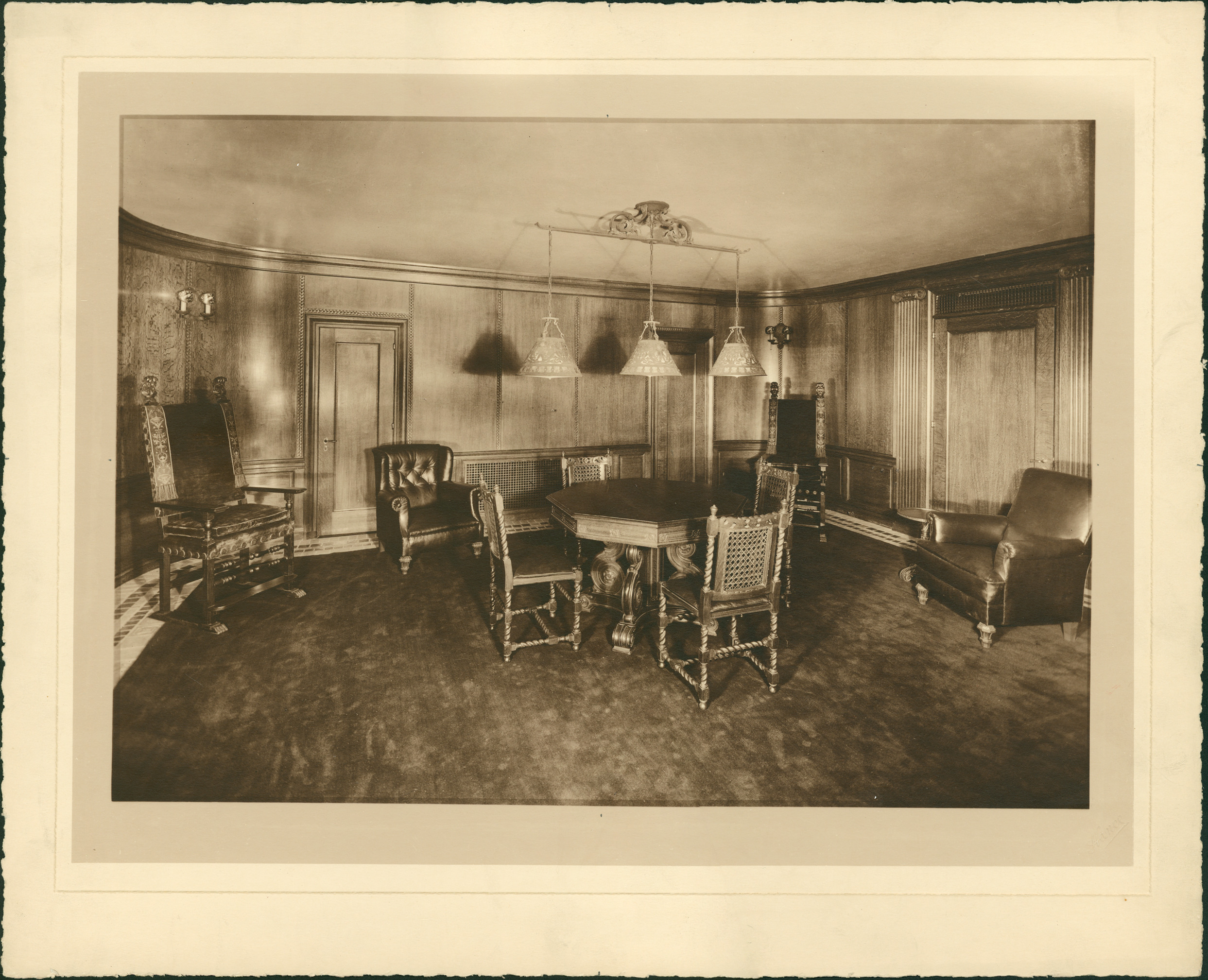 Wood-paneled room with octagonal table in middle, four chairs around it and low-hanging light fixture above, possible game room. Embossed on photo front: "Hance." Stamped on photo back: "George D. Mason & Co., architects, 508 Griswold St., Detroit, Mich."
