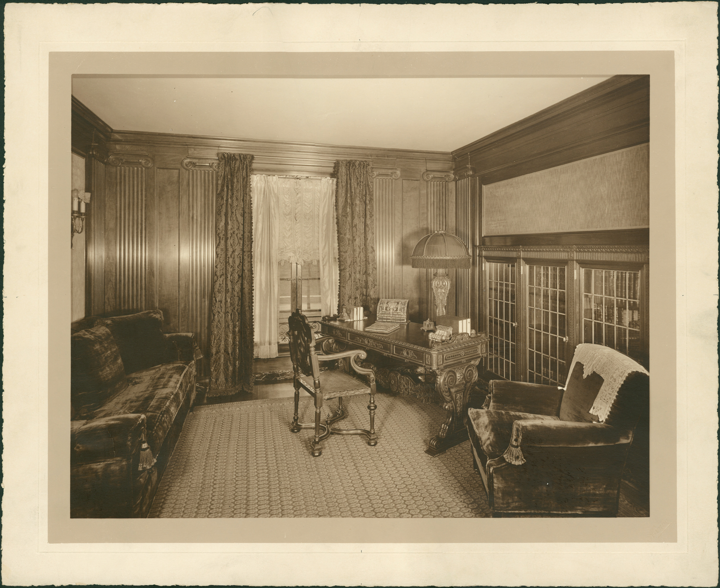 Wood-paneled room with built-in bookcases, an ornately carved desk with chair in corner, and velvet-upholstered armchair and sofa. Embossed on photo front: "Hance." Stamped on photo back: "George D. Mason & Co., architects, 508 Griswold St., Detroit, Mich."