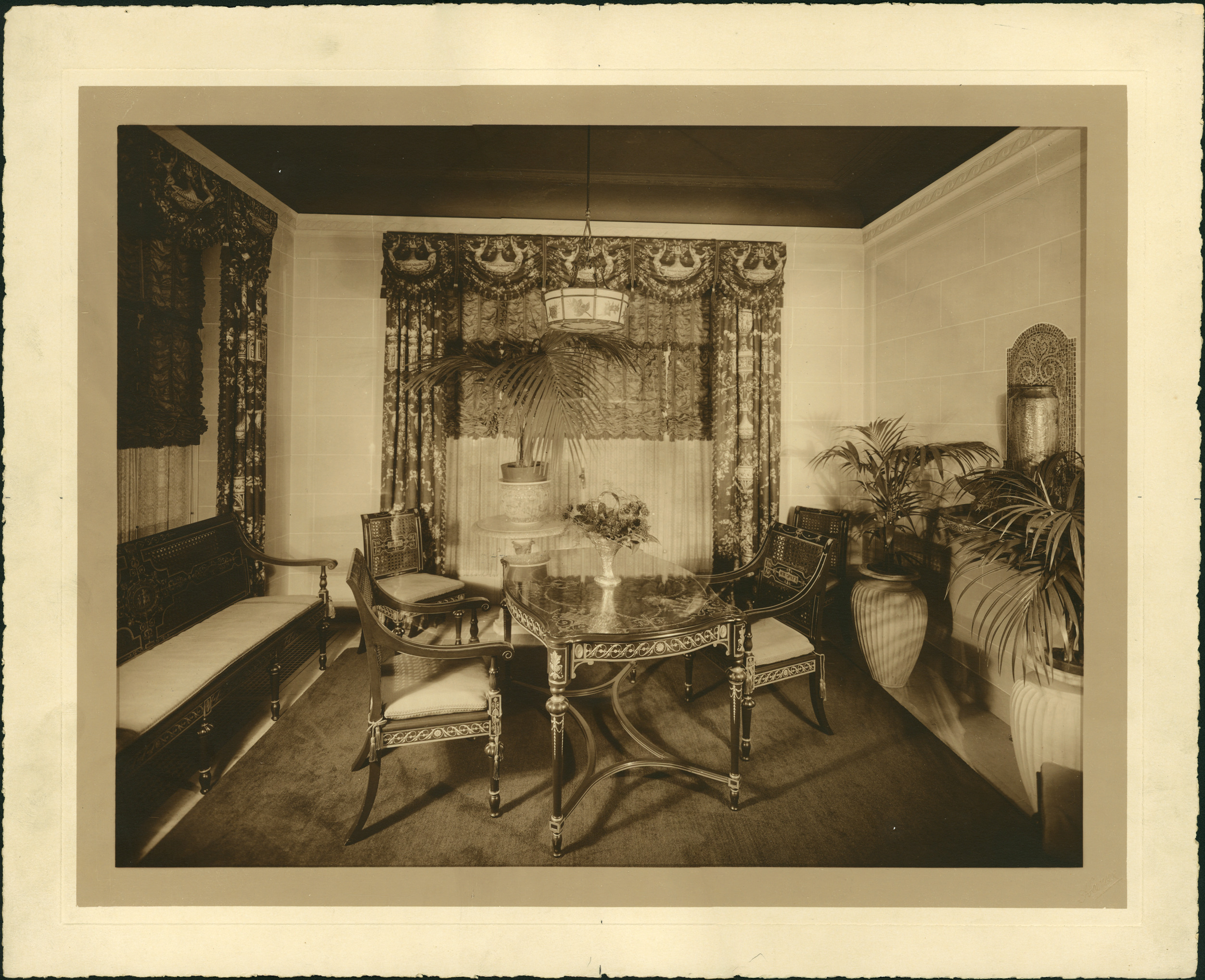 View of a room with large-tiled walls, mosaic-tiled fountain on one wall, several potted palms, and table with in-laid designs and cane-backed chairs. Embossed on photo front: "Hance." Stamped on photo back: "George D. Mason & Co., architects, 508 Griswold St., Detroit, Mich."