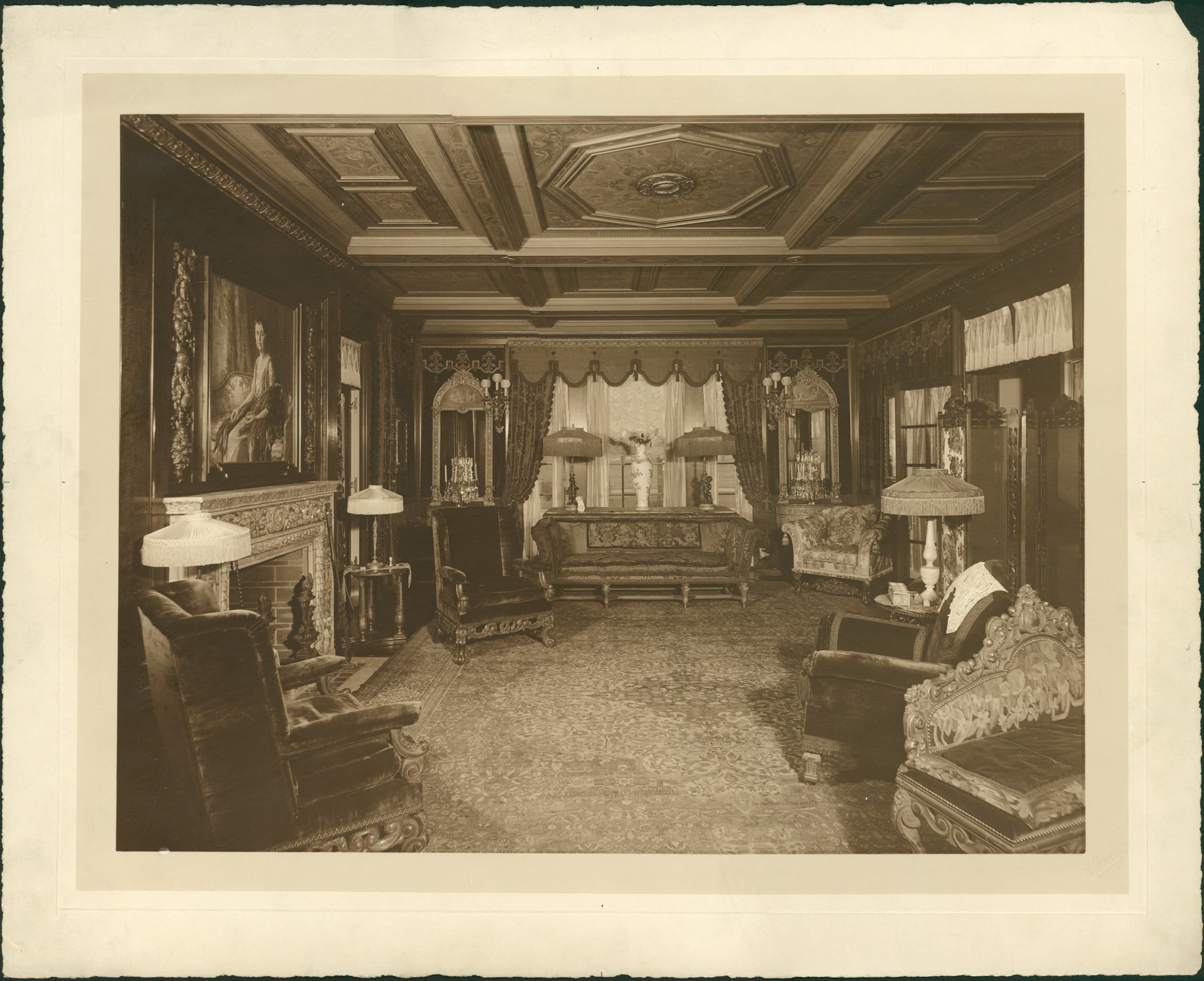 Living room with carved ceiling and carved stone fireplace over which a portrait of a woman is hung. Velvet armchairs and lamps with fringed shades, an Oriental rug and other accoutrements in room. Embossed on photo front: "Hance." Stamped on photo back: "George D. Mason & Co., architects, 508 Griswold St., Detroit, Mich."