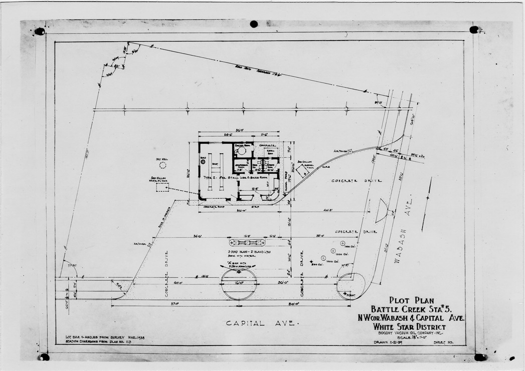 Plot plan for gas station in Battle Creek, Michigan located at Wabash and Capital. Printed on front: 'Plot plan, Battle Creek Sta. #5. N.W. cor. Wabash & Capital Ave., White Star District. Socony Vacuum Oil Company, Inc., scale 1/8" = 1'-0". Drawn 11-21-39, lot size & angles from survey, Mar. 1938; station dimensions from plan no. 113.' Handwritten on back: "B. Creek #5."