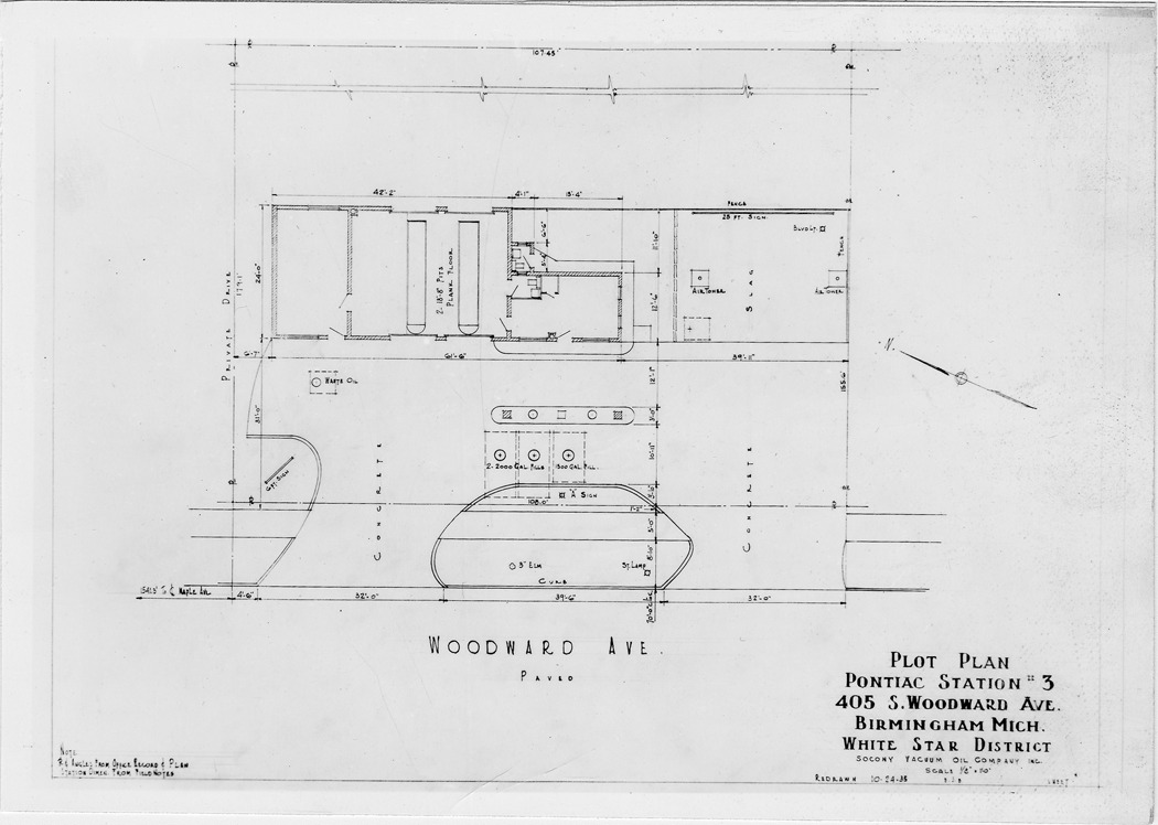 Plot plan for gas station number 3 located in Birmingham, Michigan. Printed on front: 'Plot plan, Pontiac station #3, 405 S. Woodward Ave., Birmingham, Mich. White Star District. Socony Vacuum Oil Company, Inc. Scale 1/8"=1'-0". Redrawn 10-24-35. Note: R & angles from office record & plan, station dimen. from field notes.'
