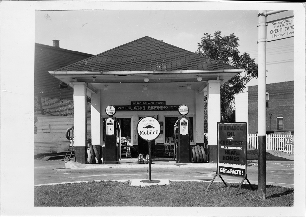 Close-up view of Mobilgas station located at Canfield and Dubois in Detroit, Michigan. Two gas pumps in front of station; signs in front of station reads: "Ask for Gargoyle Mobiloil" and "Furnace oil is the cheapest fully automatic heat for homes, get the facts!" Sign on station: "Pasko Balaichi, authorized dealer, White Star Refining Co."