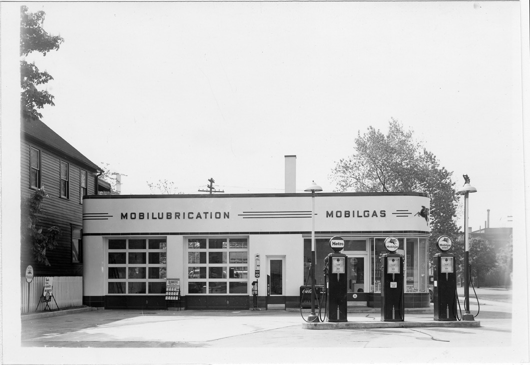Close-up of Mobilgas station located at Crawford and W. Fort St. in Detroit, Michigan. Three gas pumps in front of station; flying horse symbol on several signs and gas pumps. Station has two service bays; signs on station: "Mobilubrication, Mobilgas."