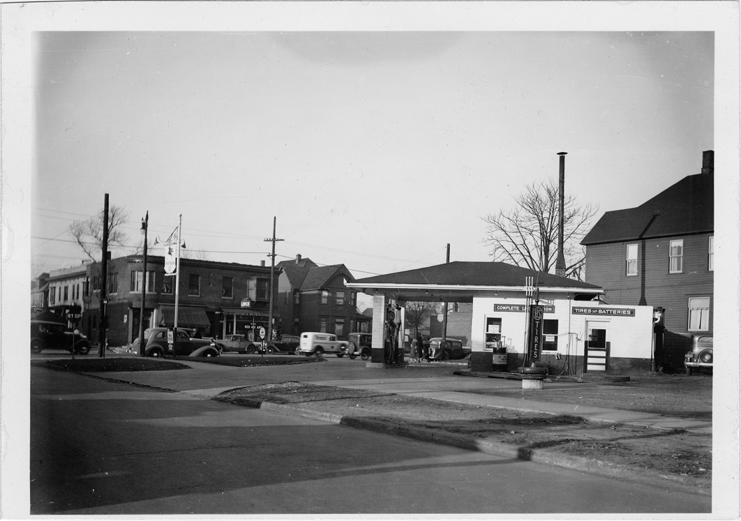 Side view of Mobilgas station located at Crawford and West Fort Street in Detroit, Michigan. Three gas pumps in front of station; flying horse symbol on corner sign; three women walk down street.