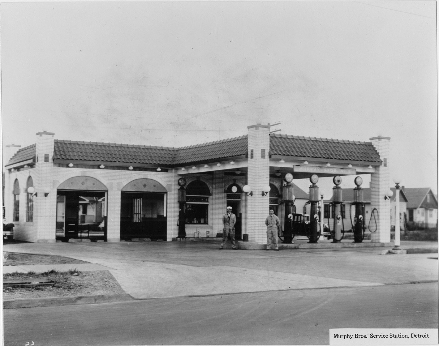 Close-up view of gas station located at Prairie and West 7 Mile in Detroit, Michigan. Four gas pumps in front of station; White Star logo on several signs and on gas pumps. Station has southwestern style tile roof. Two gas station attendants stand in front of pumps. Printed on front: "Murphy Bros.' Service Station, Detroit."