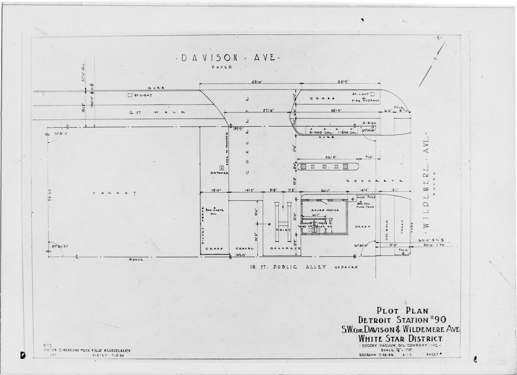 Plot plan for gas station number 90 located in Detroit, Michigan. Printed on front: 'Plot plan, Detroit Station #90, S.W. cor. Davison & Wildemere Ave. White Star District. Socony Vacuum Oil Company, Inc. Scale 1/8"=1'-0". Redrawn 7-29-36. Note: Station dimensions from field measurements, lot [dimensions from] survey, 7-15-30.'