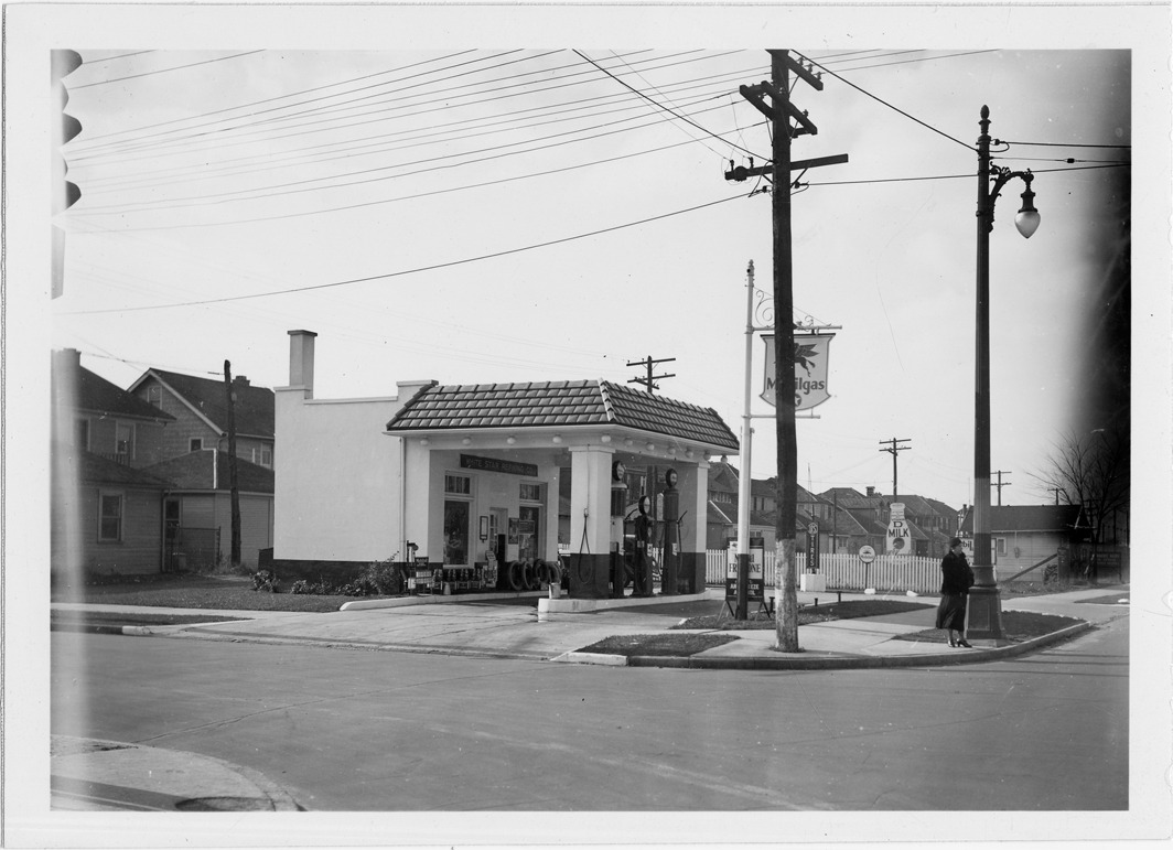 Side view of Mobilgas station with tile roof located at Davison and Wildemere Ave. in Detroit, Michigan, with houses behind. Flying horse symbol on several signs and gas pumps. Sign on building: "White Star Refining Co." Woman stands by lamppost; houses in the background.