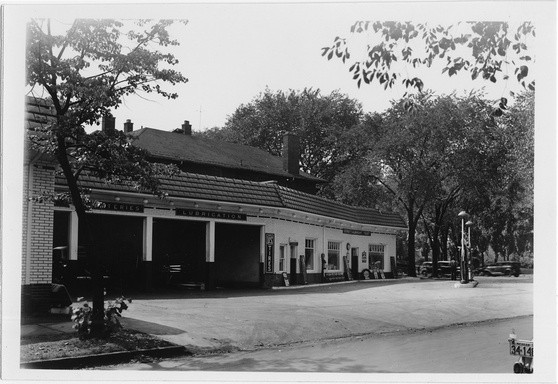 Full view of brick Mobilgas station with tile roof and several service bays located at 15th St. and Grand Blvd. in Detroit, Michigan, with houses behind. Sign on station reads: "US Tires." Sign over entrance: "George T. Albright."