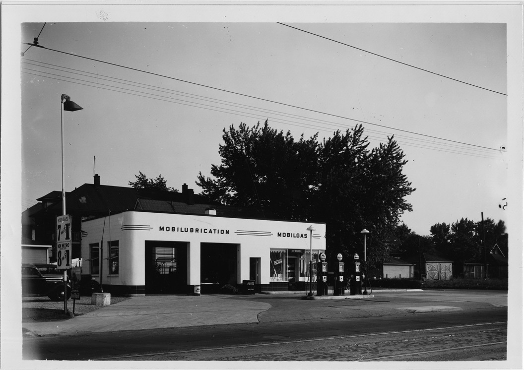 Front view of Mobilgas station with two service bays located at Forest and Rohns Ave. in Detroit, Michigan. Three gas pumps in front of station; flying horse symbol on gas pumps. Signs on building: "Mobilubrication, Mobilgas."