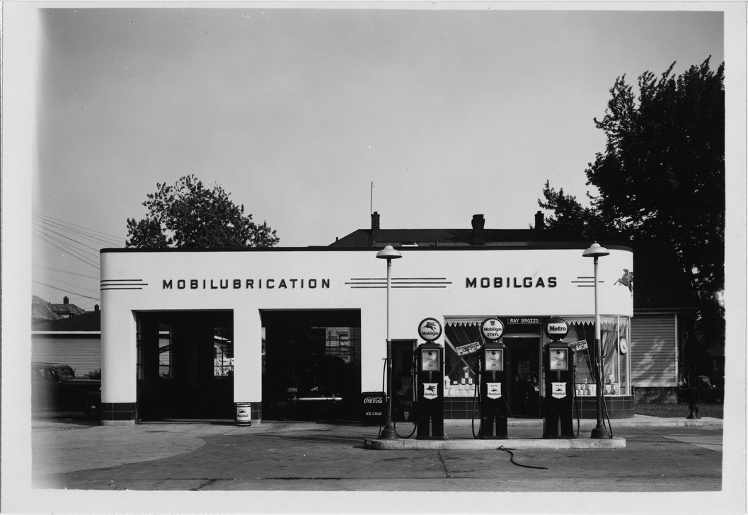 Front view of Mobilgas station with two service bays located at Forest and Rohns Ave. in Detroit, Michigan. Three gas pumps in front of station; flying horse symbol on building and gas pumps. Signs on building: "Mobilubrication, Mobilgas." Sign over entrance: "Ray Brozzo."