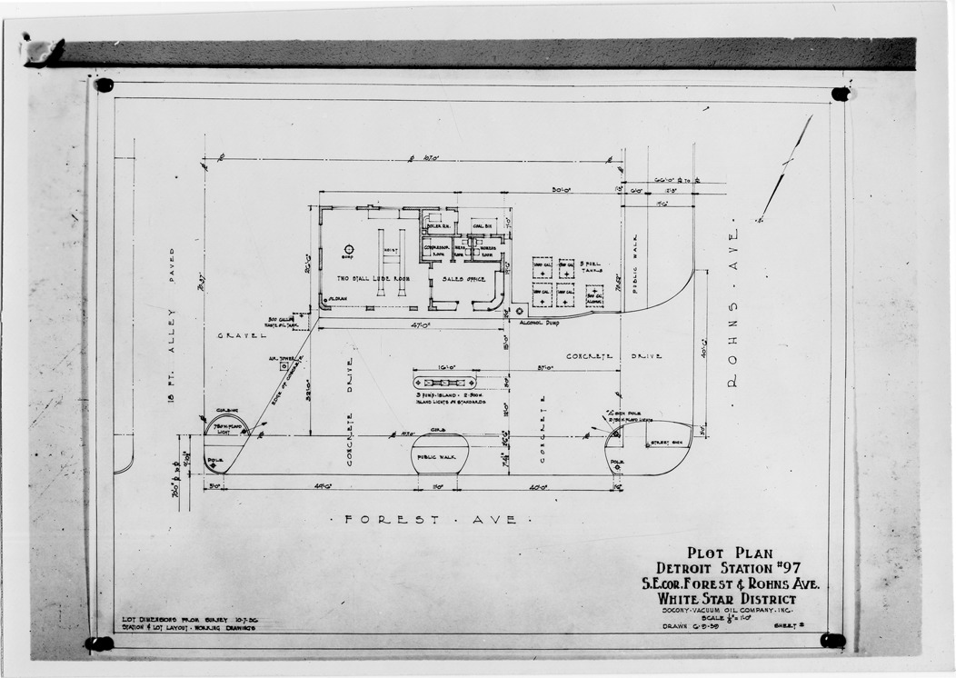Plot plan for gas station number 97 located in Detroit, Michigan. Printed on front: 'Plot plan, Detroit Station #97, S.E. cor. Forest & Rohns Ave. White Star District. Socony Vacuum Oil Company, Inc. Scale 1/8"=1'-0". Drawn 6-9-39. Note: Lot dimensions from survey, 10-7-36, station & lot layout, working drawings.'