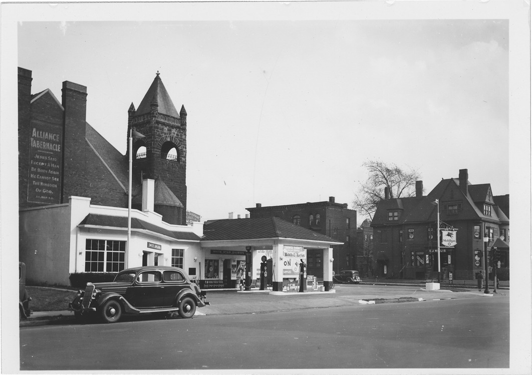 Side view of Mobilgas station located at Forest and Second Ave. in Detroit, Michigan. Mobilgas sign with flying horse symbol in front of station; sign over entrance: "White Star Division." Brick church building with bell tower in background; painted on side of church: "Alliance Tabernacle." Automobile parked in street.