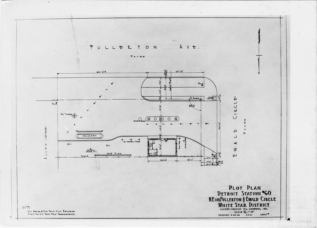 Plot plan for gas station number 60 located in Detroit, Michigan. Printed on front: 'Plot plan, Detroit Station #60, N.E. cor. Fullerton & Ewald Circle. White Star District. Socony Vacuum Oil Company, Inc. Scale 1/8"=1'-0". Redrawn 6-25-36. Note: Lot angles & dim. from city records, station dim. from field measurements.'