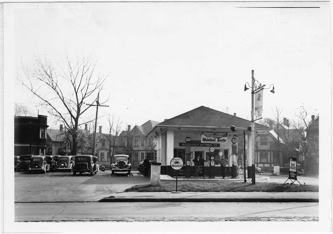 Close-up of Mobilgas station with hipped roof located at Gratiot and Sylvester in Detroit, Michigan. Two service station attendants pose next to gas pumps in front of station. Sign over pumps: "Change today! for easy starting Mobiloil Arctic." White Star Refining Co. sign over building entrance; Mobilgas sign with flying horse symbol in front of station. Row of automobiles parked next to station.