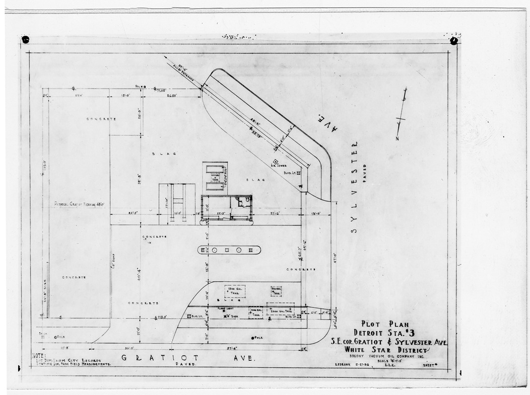 Plot plan for gas station number 3 located in Detroit, Michigan. Printed on front: 'Plot plan, Detroit Station #3, S.E. cor. Gratiot & Sylvester Ave. White Star District. Socony Vacuum Oil Company, Inc. Scale 1/8"=1'-0". Redrawn 2-27-36. Note: Lot dim. from city records, station dim. from field measurements.'