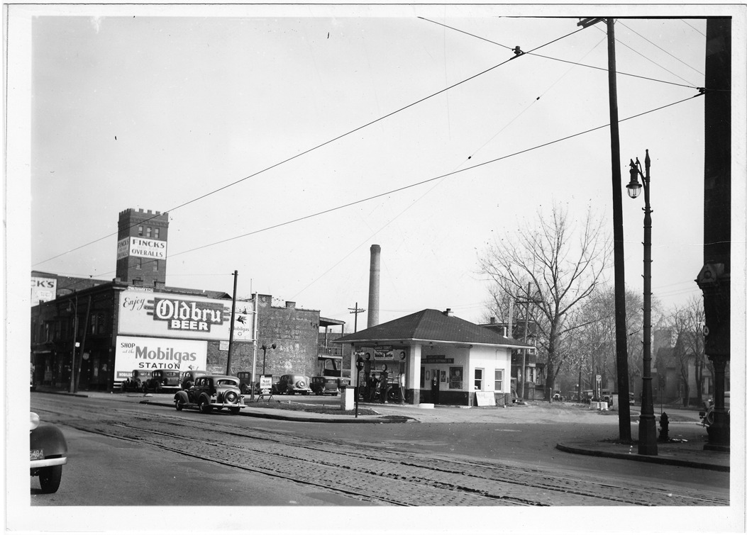 Front and side view of Mobilgas station with hipped roof located at Gratiot and Sylvester in Detroit, Michigan. Service station attendant poses next to three gas pumps in front of station; sign over entrance: "White Star Refining Co." Billboards on adjacent brick building: "Enjoy Oldbru beer" and "Shop at the Mobilgas station." Sign on castellated brick tower in background: "Finck's overalls." Row of automobiles parked next to building.