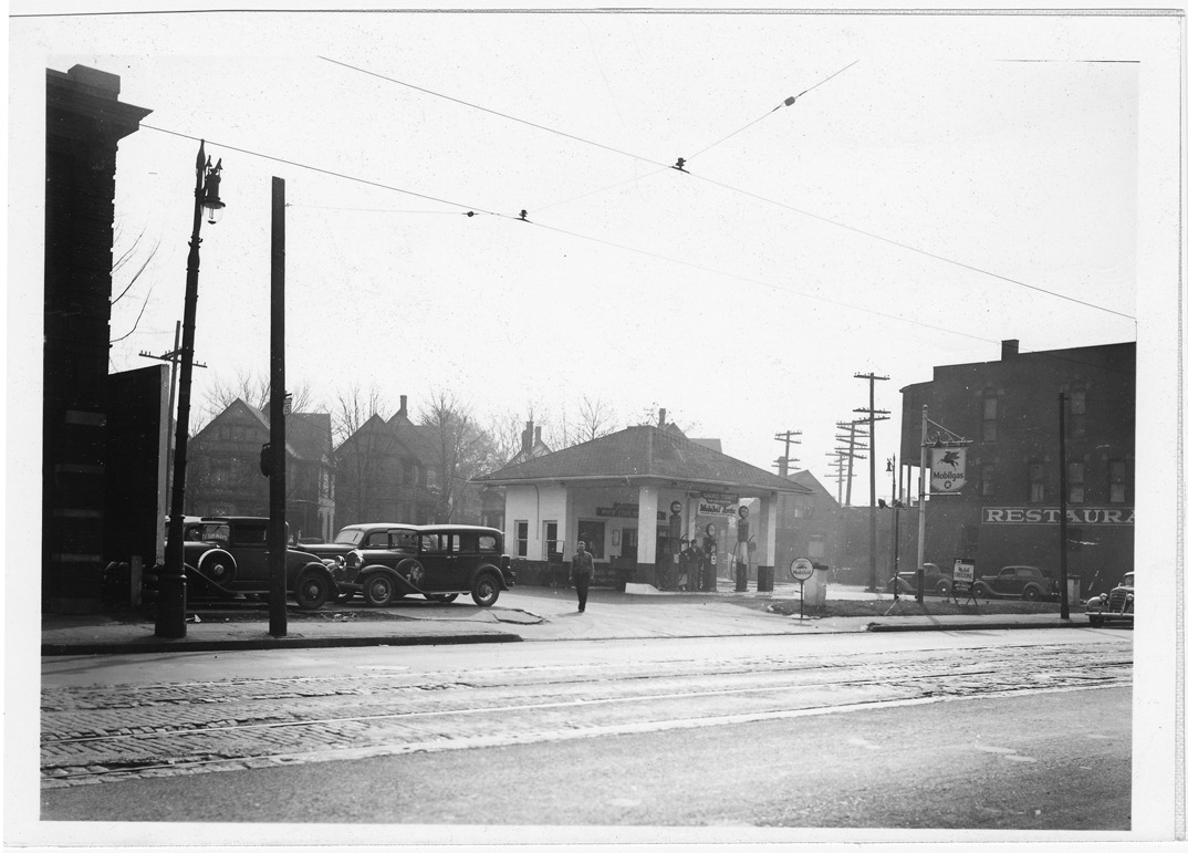Front and side view of Mobilgas station with hipped roof located at Gratiot and Sylvester in Detroit, Michigan. Service station attendant poses next to three gas pumps in front of station; sign over entrance: "White Star Refining Co." Mobiloil Arctic sign hangs over gas pumps; Mobilgas sign with flying horse symbol in front of station. Man stands on sidewalk next to row of parked automobiles.