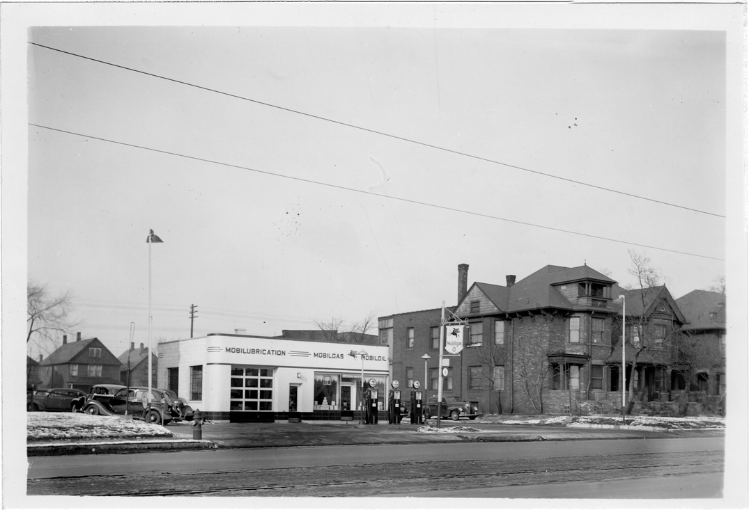 View of Mobilgas station located at 3383 E. Jefferson in Detroit, Michigan. Three gas pumps in front of station; signs on building: "Mobilubrication, Mobilgas, Mobiloil." Mobilgas sign with flying horse symbol in front of station; automobiles parked on lot. Brick house adjacent to station.