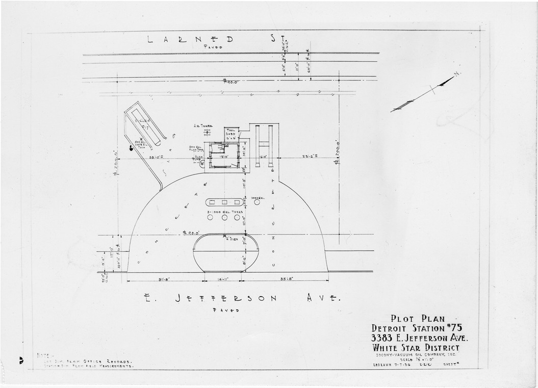 Plot plan for gas station number 75 located in Detroit, Michigan. Printed on front: 'Plot plan, Detroit Station #75, 3383 E. Jefferson Ave. White Star District. Socony Vacuum Oil Company, Inc. Scale 1/8"=1'-0". Redrawn 7-7-36. Note: Lot dim. from office records, station dim. from field measurements.'