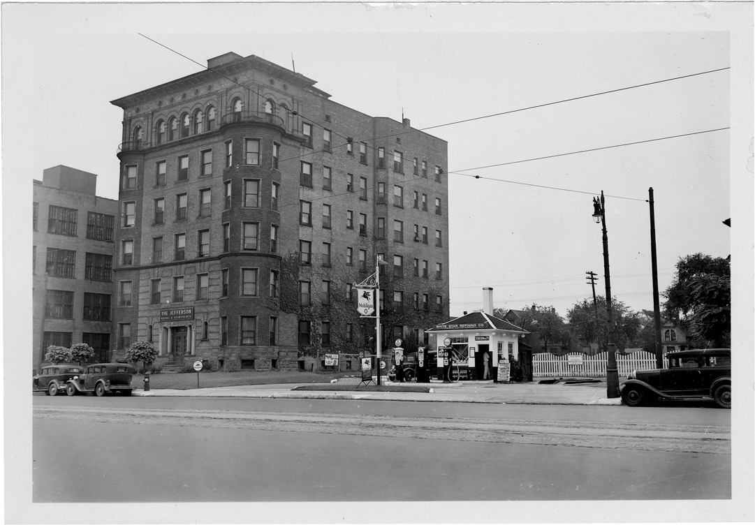 View of Mobilgas station number 75 with hipped roof located at 3383 E. Jefferson in Detroit, Michigan. Three gas pumps in front of station; signs on building: "White Star Refining Co., Station no. 75." Mobilgas sign with flying horse symbol in front of station. Station is adjacent to multistory brick apartment building; sign over entrance: "The Jefferson, rooms & apartments."