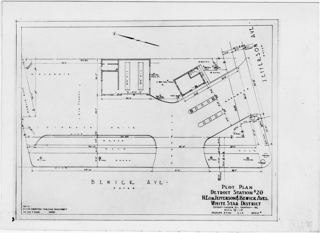 Plot plan for gas station number 20 located in Detroit, Michigan. Printed on front: 'Plot plan, Detroit Station #20, N.E. cor. Jefferson & Bewick Aves. White Star District. Socony Vacuum Oil Company, Inc. Scale 1/8"=1'-0". Redrawn 3-4-36. Note: Station dimensions from field measurements, lot size & angles [from] survey.'