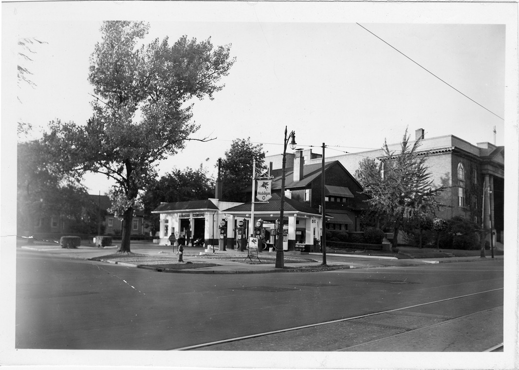 View from across intersection of Mobilgas station with hipped roof located at E. Jefferson and Bewick in Detroit, Michigan. Six gas pumps in front of station; station has detached building with two service bays. Houses and brick building with columns and pediment in background.