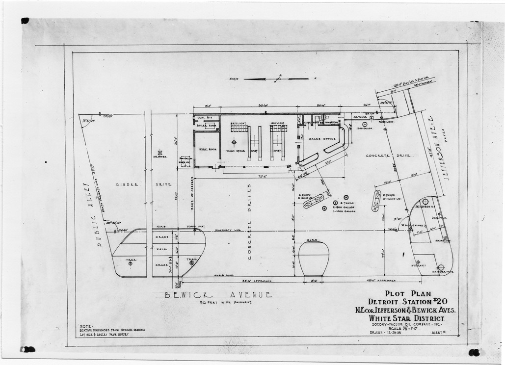 Plot plan for gas station number 20 located in Detroit, Michigan. Printed on front: 'Plot plan, Detroit Station #20, N.E. cor. Jefferson & Bewick Aves. White Star District. Socony Vacuum Oil Company, Inc. Scale 1/8"=1'-0". Drawn 12-28-38. Note: Station dimensions from working drawings, lot size & angles from survey.'