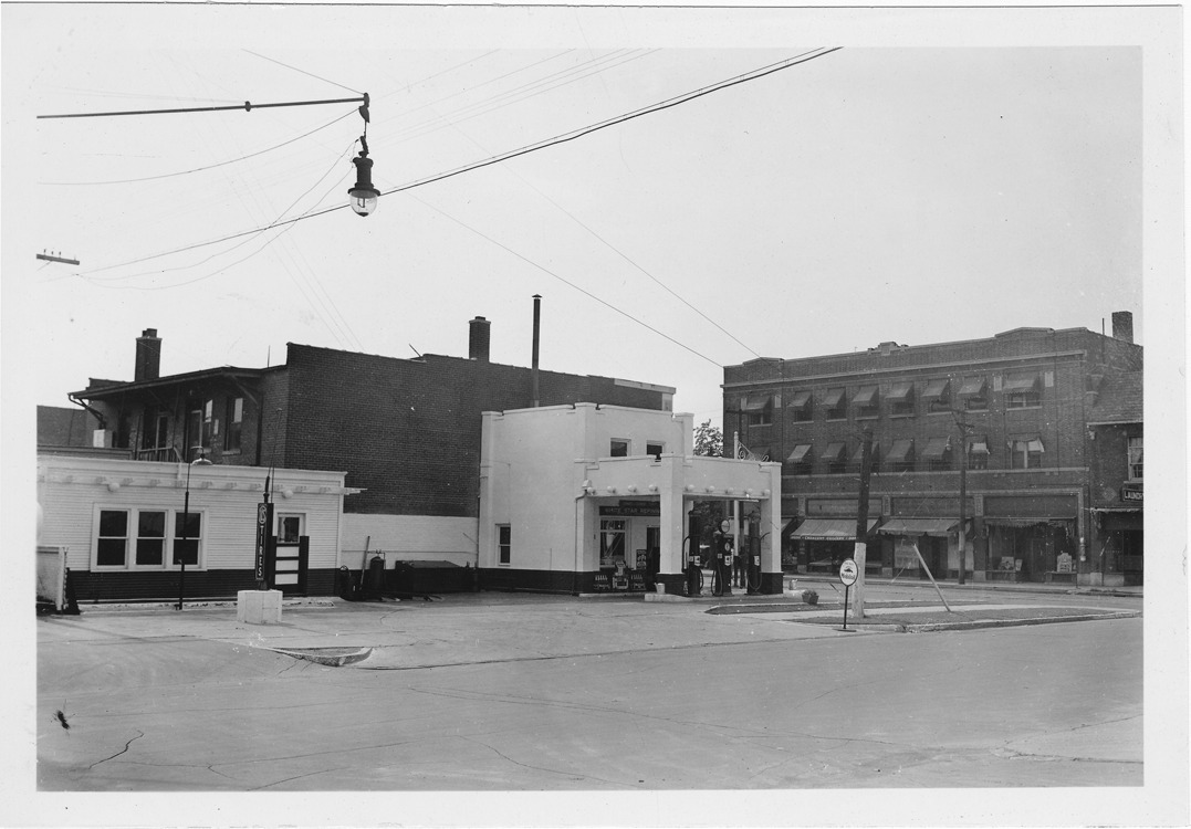 Front and side view of two-story Mobilgas station with castellated roof located at Joy Rd. and Wildemere in Detroit, Michigan. Three gas pumps in front of station; sign over entrance: "White Star Refining Co., Edward J. Eckert, authorized dealer." Station has detached one-story wooden-frame building. Three-story brick commercial building with storefronts in background.