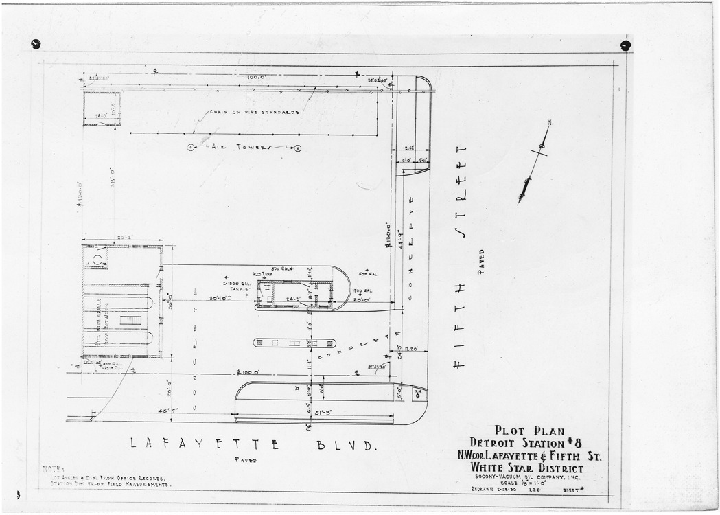 Plot plan for gas station number 8 located in Detroit, Michigan. Printed on front: 'Plot plan, Detroit Station #8, N.W. cor. Lafayette & Fifth St. White Star District. Socony Vacuum Oil Company, Inc. Scale 1/8"=1'-0". Redrawn 2-28-36. Note: Lot angles & dim. from office records, station dim. from field measurements.'