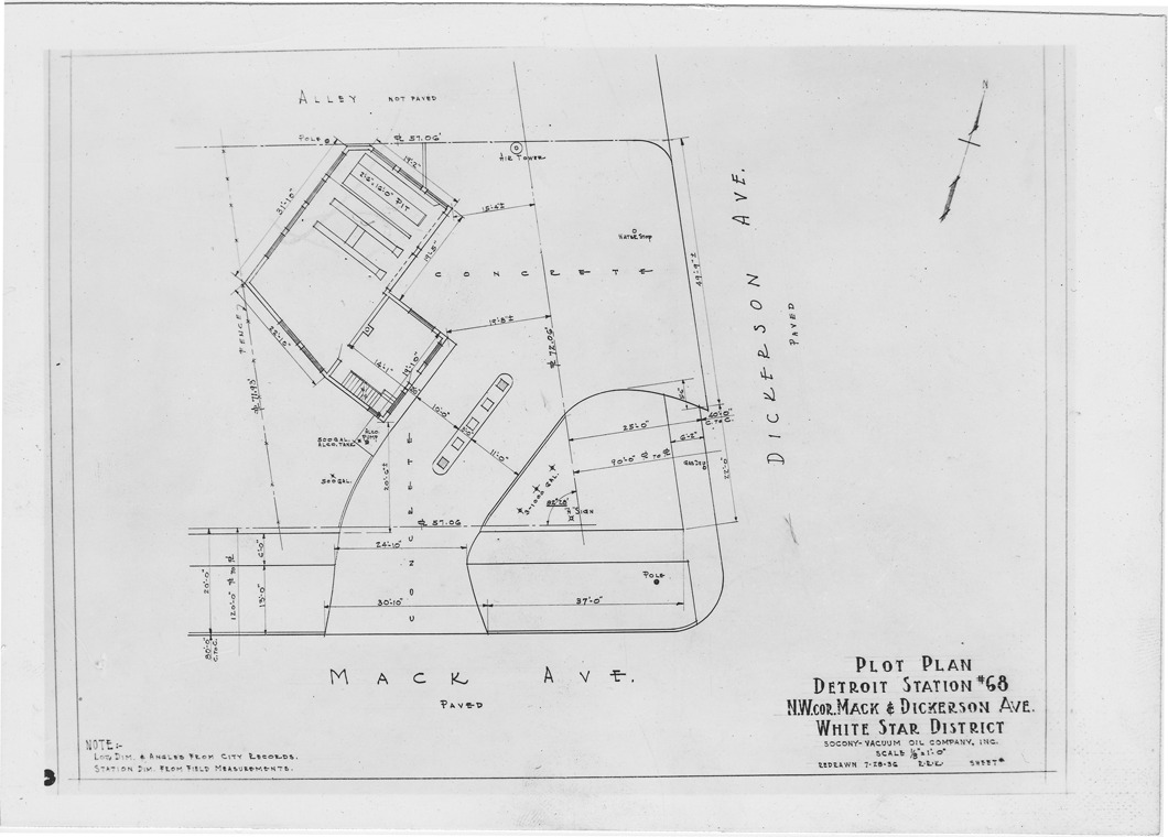 Plot plan for gas station number 68 located in Detroit, Michigan. Printed on front: 'Plot plan, Detroit Station #68, N.W. cor. Mack & Dickerson Ave. White Star District. Socony Vacuum Oil Company, Inc. Scale 1/8"=1'-0". Redrawn 7-28-36. Note: Lot dim. & angles from city records, station dim. from field measurements.'