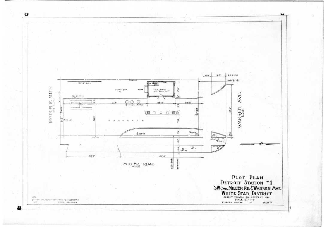 Plot plan for gas station number 1 located in Detroit, Michigan. Printed on front: 'Plot plan, Detroit Station #1, S.W. cor. Miller Rd. & Warren Ave. White Star District. Socony Vacuum Oil Company, Inc. Scale 1/8"=1'-0". Redrawn 2-26-36. Note: Station dimensions from field measurements, lot [dimensions from] office records.'