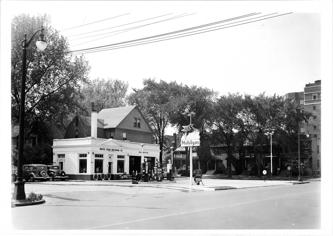 Front and side view of Mobilgas station with two service bays located at Second and Philadelphia in Detroit, Michigan. Neoclassical style brick building has pilasters and triangular pediment on facade. Three gas pumps in front of station; sign over entrance: "White Star Refining Co." Automobiles parked next to station; neon Mobilgas sign with flying horse symbol in front of station. Houses in background.