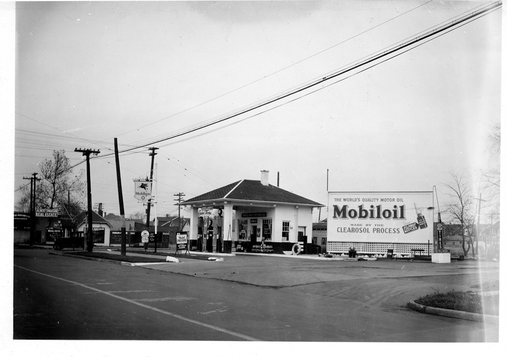 Side view of Mobilgas station with hipped roof located at State Fair and John R in Detroit, Michigan. Three gas pumps in front of station; sign over entrance: "White Star Refining Co." Mobilgas sign with flying horse symbol on corner; billboard adjacent to station reads: "The world's quality motor oil, Mobiloil from Filpruf bottles, made by the Clearosol Process." Albert Swanson Real Estate office in background.