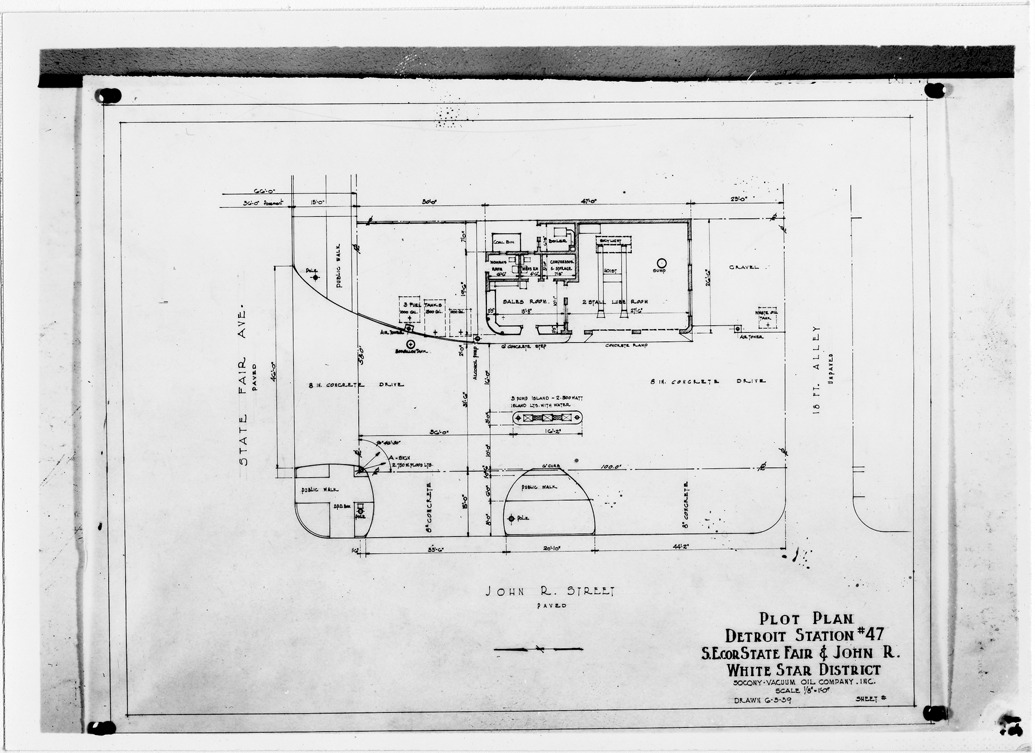 Plot plan for gas station number 47 located in Detroit, Michigan. Printed on front: 'Plot plan, Detroit Station #47, S.E. cor. State Fair & John R. White Star District. Socony Vacuum Oil Company, Inc. Scale 1/8"=1'-0". Drawn 6-3-39.'