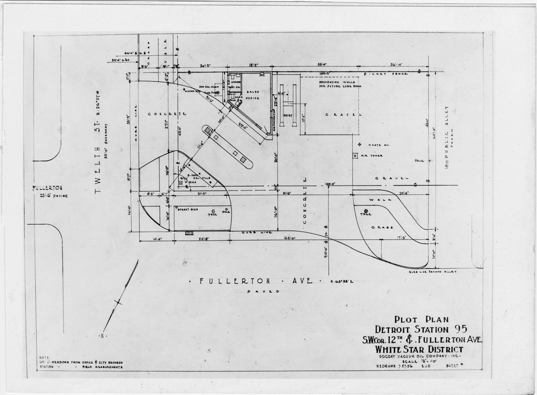 Plot plan for gas station number 95 located in Detroit, Michigan. Printed on front: 'Plot plan, Detroit Station #95, S.W. cor. 12th & Fullerton Ave. White Star District. Socony Vacuum Oil Company, Inc. Scale 1/8"=1'-0". Redrawn 7-27-36. Note: Lot dimensions from office & city records, station [dimensions from] field measurements.'
