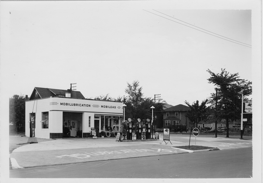 View at an angle of Mobilgas station with one service bay located at 12th St. and Fullerton in Detroit, Michigan. Three gas pumps in front of station; signs on building: "Mobilubrication, Mobilgas." Painted on driveway: "75 [cent] lubrication." Mobilgas sign with flying horse symbol in front of station; houses in background.