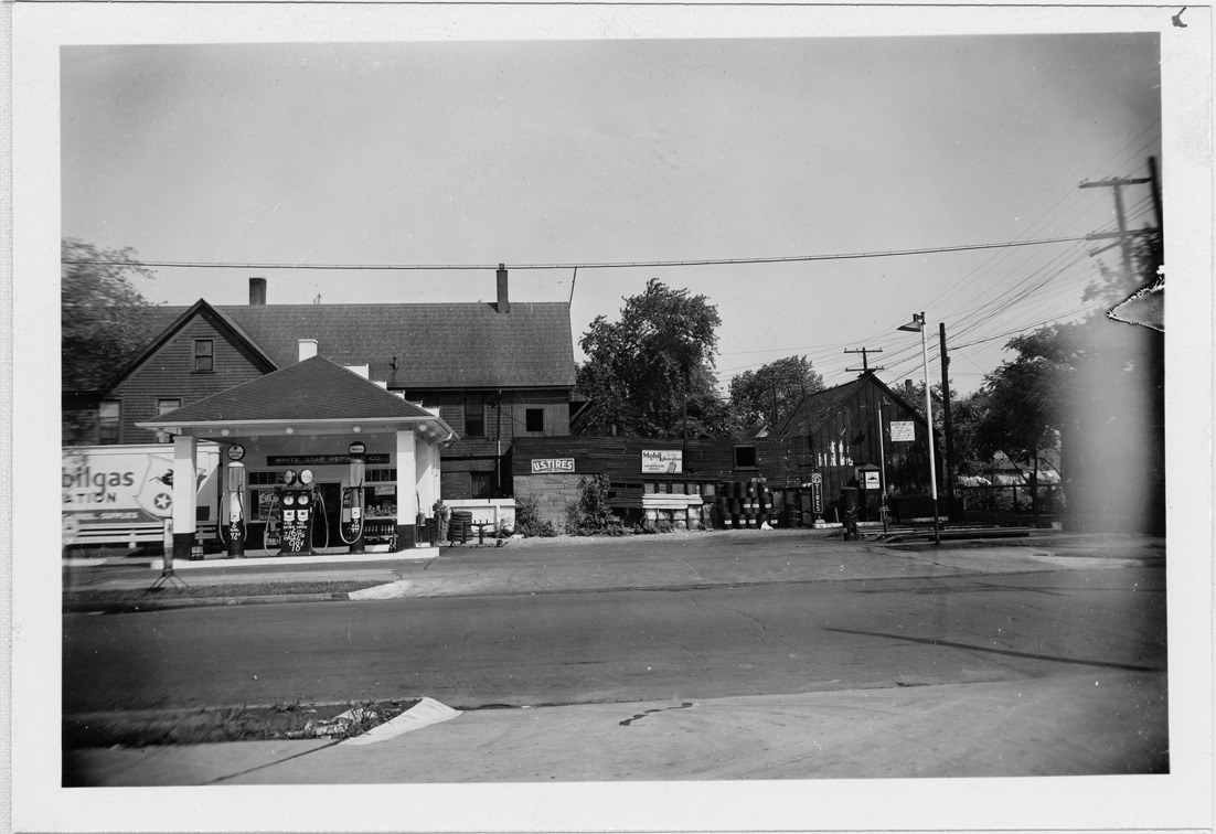 View of Mobilgas station with hipped roof located at Warren and Mt. Elliott in Detroit, Michigan. Four gas pumps in front of station; sign over entrance: "White Star Refining Co." US Tires and Mobilubrication signs on wooden fence in back of station; houses in background.