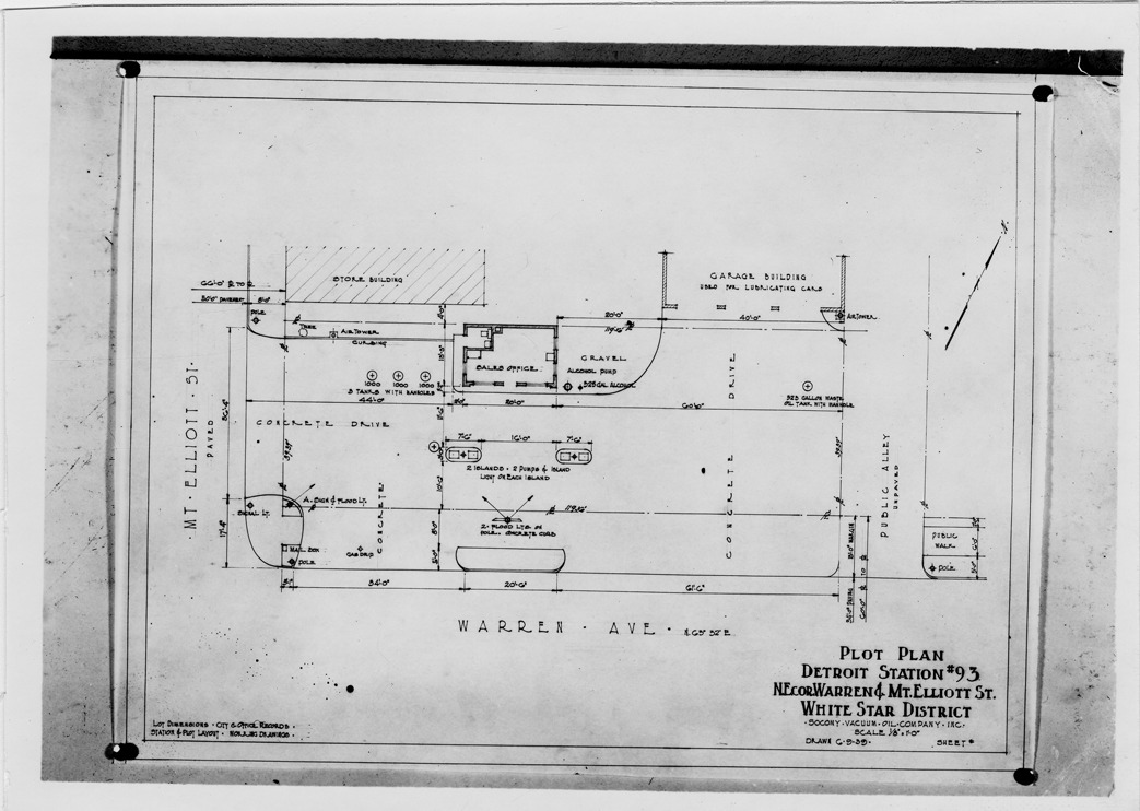 Plot plan for gas station number 93 located in Detroit, Michigan. Printed on front: 'Plot plan, Detroit Station #93, N.E. cor. Warren & Mt. Elliott St. White Star District. Socony Vacuum Oil Company, Inc. Scale 1/8"=1'-0". Drawn 6-9-39. Note: Lot dimensions, city & office records, station & plot layout, working drawings.'
