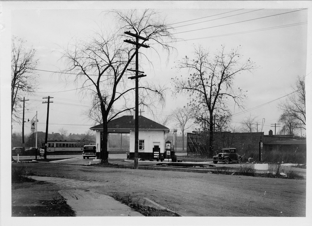 Side view of Mobilgas station with hipped roof located at Woodward and Bryson in Detroit, Michigan. Mobilgas station with flying horse symbol and Mobil Freezone sign in front of station; automobile parked next to US Tires air pump in back of lot. Streetcar in background.