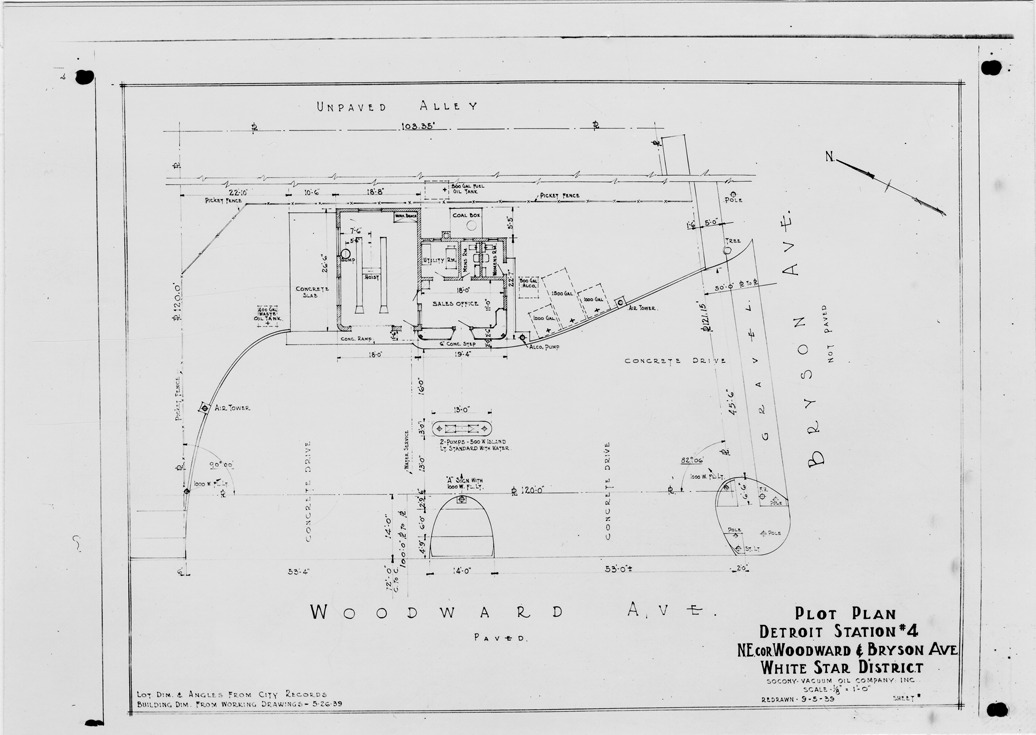 Plot plan for gas station number 4 located in Detroit, Michigan. Printed on front: 'Plot plan, Detroit Station #4, N.E. cor. Woodward & Bryson Ave. White Star District. Socony Vacuum Oil Company, Inc. Scale 1/8"=1'-0". Redrawn 9-5-39. Note: Lot dim. & angles from city records, building dim. from working drawings, 5-26-39.'