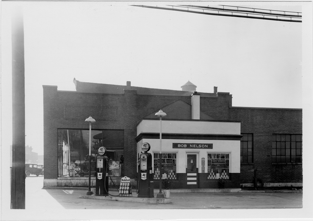 View of Mobilgas station with flat roof and chimney located at Saginaw and Genesee in Durand, Michigan. Two gas pumps with Mobilgas signs in front of station; sign over entrance: "Bob Nelson." One-story brick building with showroom located behind station, possibly an automobile dealership.