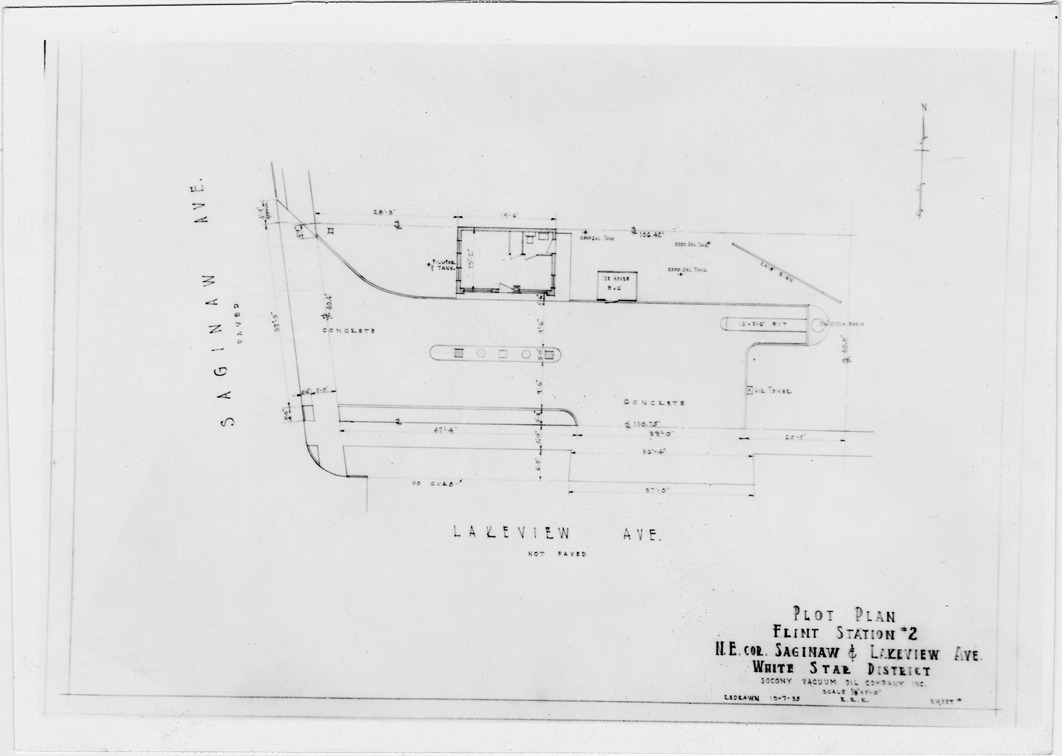 Plot plan for gas station number 2 located in Flint, Michigan. Printed on front: 'Plot plan, Flint Station #2, N.E. cor. Saginaw & Lakeview Ave. White Star District. Socony Vacuum Oil Company, Inc. Scale 1/8"=1'-0". Redrawn 10-7-35.'