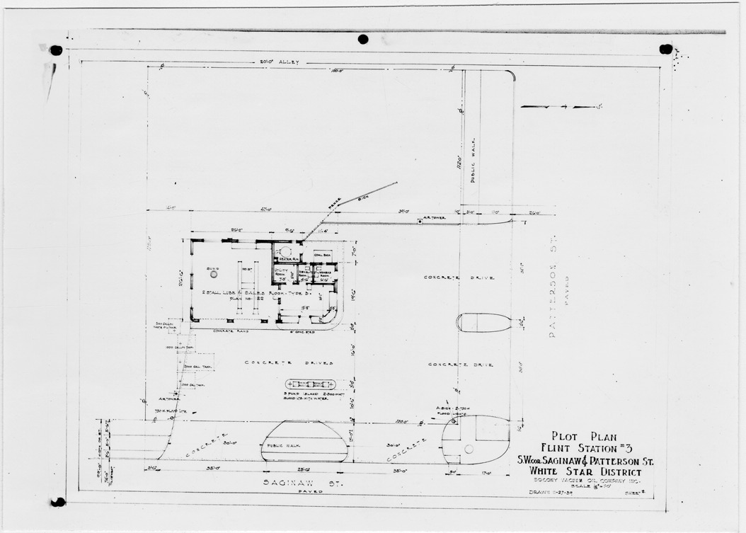 Plot plan for gas station number 3 located in Flint, Michigan. Printed on front: 'Plot plan, Flint Station #3, S.W. cor. Saginaw & Patterson St. White Star District. Socony Vacuum Oil Company, Inc. Scale 1/8"=1'-0". Drawn 11-27-39.'